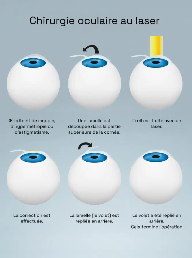 En cas de myopie, lorsque la vision de loin est floue à cause d’un œil trop long ou d’une cornée trop bombée, l’intervention consiste à aplatir légèrement la cornée pour rétablir une mise au point correcte. Pour l’hypermétropie, qui entraîne des difficultés à voir de près, la chirurgie accentue la courbure cornéenne afin de concentrer les rayons lumineux sur la rétine. L’astigmatisme, responsable d’images déformées ou brouillées, est quant à lui corrigé en uniformisant la surface cornéenne, ce qui permet d’obtenir une vision plus nette dans toutes les directions. Enfin, la presbytie, trouble visuel lié au vieillissement naturel de l’œil et se manifestant par une perte de la vision de près, peut également être corrigée grâce à des techniques spécifiques qui restaurent une vision fonctionnelle à plusieurs distances.