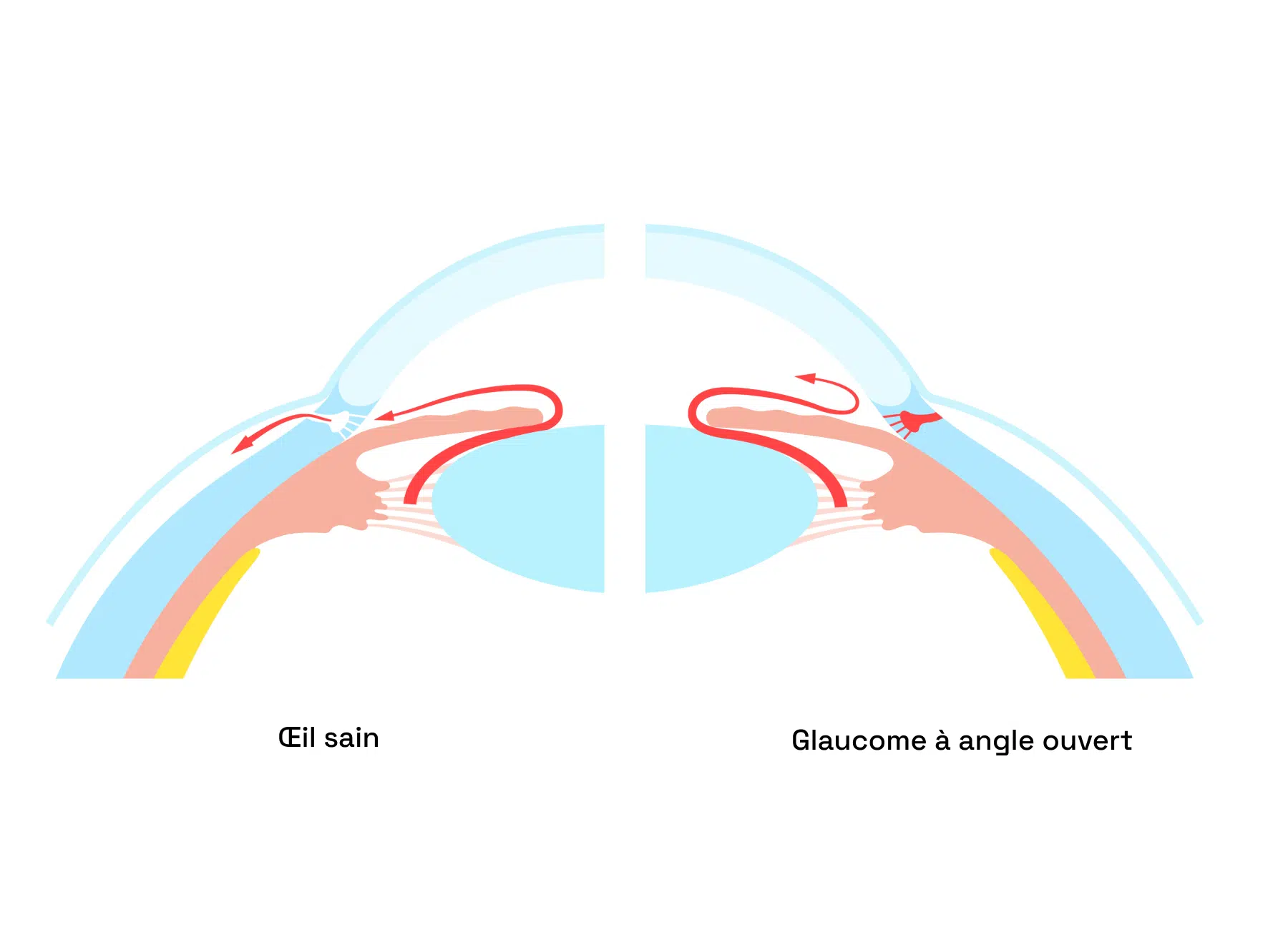 Le glaucome primitif à angle ouvert évolue lentement et de manière insidieuse, sans symptômes visibles dans les premiers stades, ce qui rend le dépistage difficile. Il est provoqué par une élévation progressive de la pression intraoculaire, conséquence d’un mauvais drainage de l’humeur aqueuse. Ce liquide intraoculaire, produit en continu, devrait normalement s’écouler par un réseau de canaux situé à l’angle entre la cornée et l’iris.