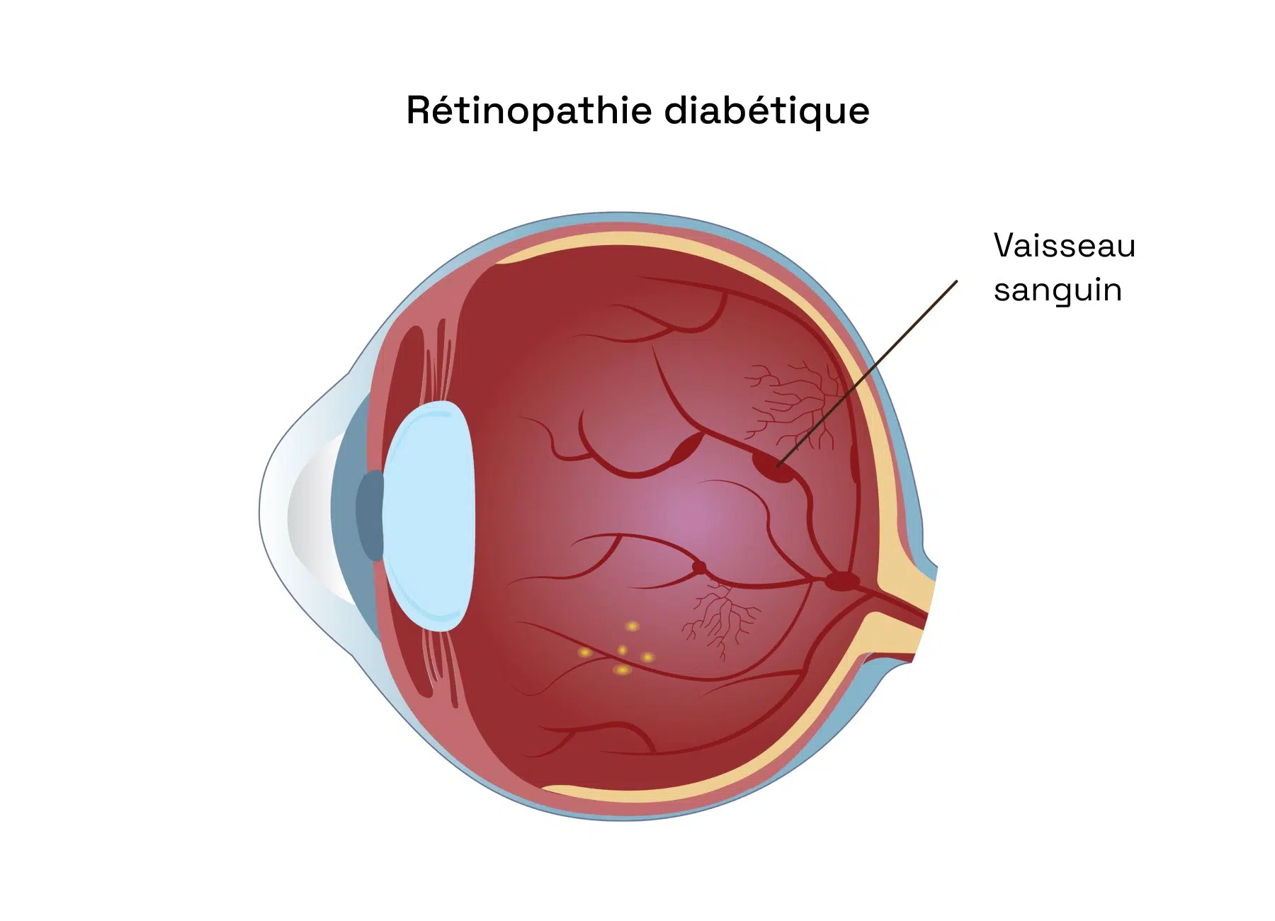 En cause : l’hyperglycémie chronique qui altère progressivement les petits vaisseaux sanguins de la rétine, générant micro-anévrismes, fuites vasculaires et zones d’ischémie. Un suivi ophtalmologique régulier est donc indispensable chez les patients diabétiques afin de détecter précocement ces lésions et éviter des séquelles irréversibles.