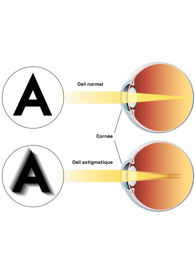 L’astigmatisme est dû à une courbure irrégulière de la cornée – ou plus rarement du cristallin – entraînant une vision floue à toutes les distances. Il peut se manifester seul ou s’associer à une myopie ou une hypermétropie.