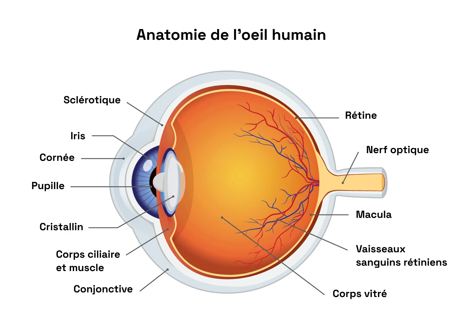 Le cristallin, situé derrière l’iris, est une lentille biconvexe. Il ajuste sa courbure grâce aux muscles ciliaires pour permettre une vision nette à toutes distances, un mécanisme appelé accommodation. Avec l’âge, la perte d’élasticité du cristallin entraîne la presbytie, réduisant la capacité à voir de près.